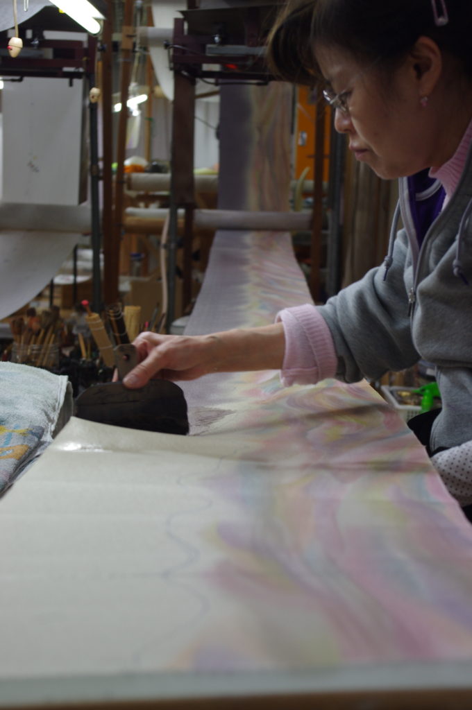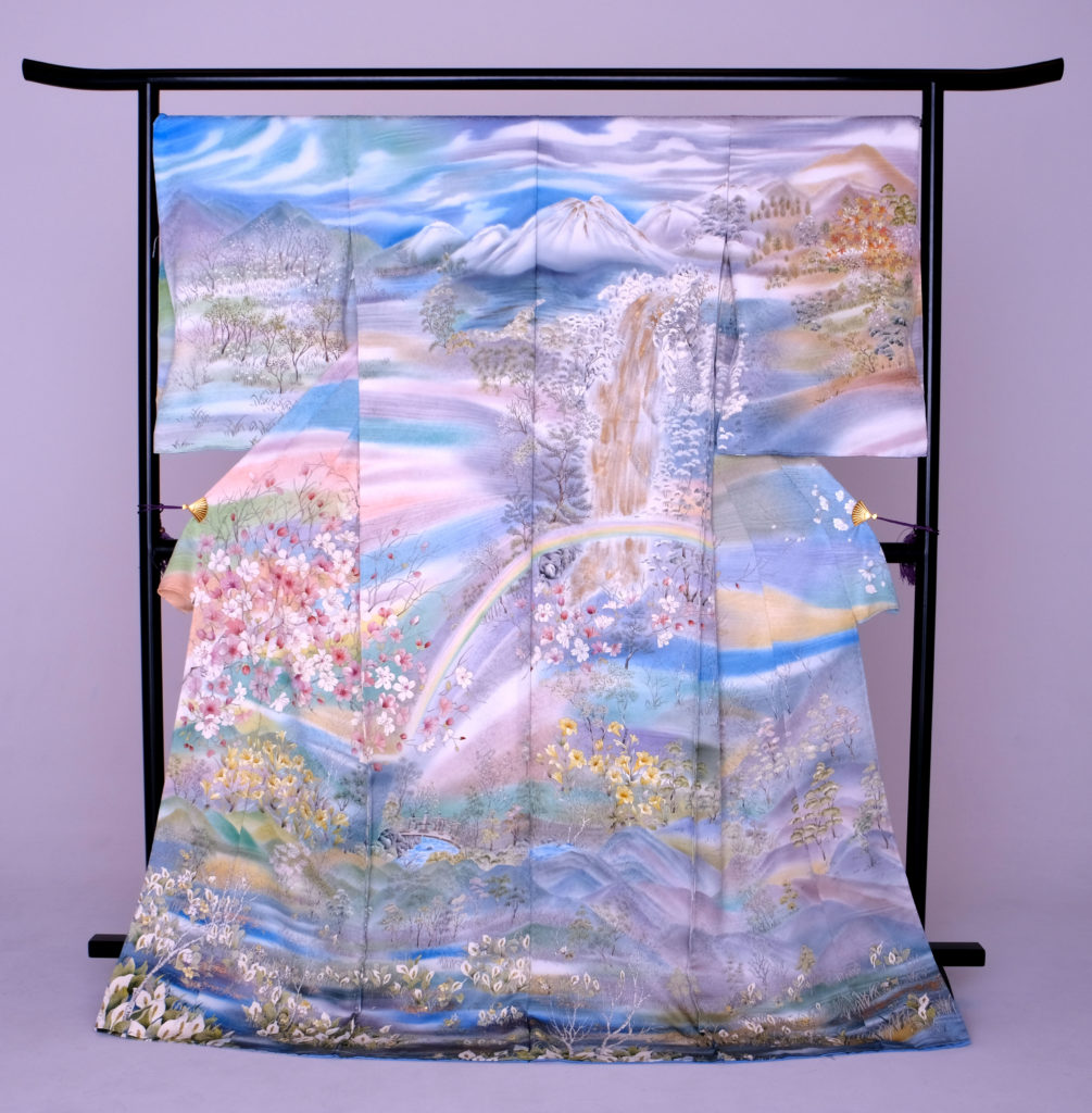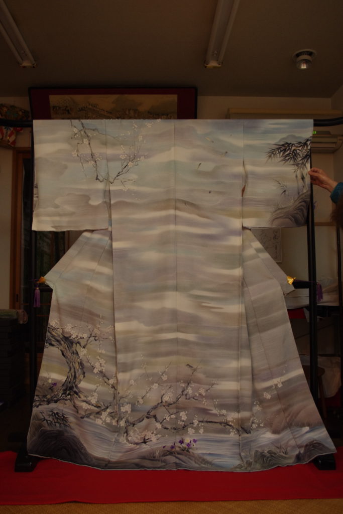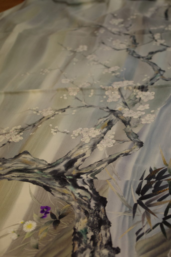 風彩染は勿論、素描と呼ばれる水墨画のような描き方や、無地場を染める「引き染め」、「ろうけつ染め」、「金彩友禅」までこなします。一人でどんだけ出来るの(笑)基本的に、着物の世界は分業制です。